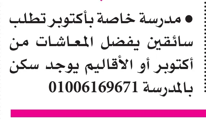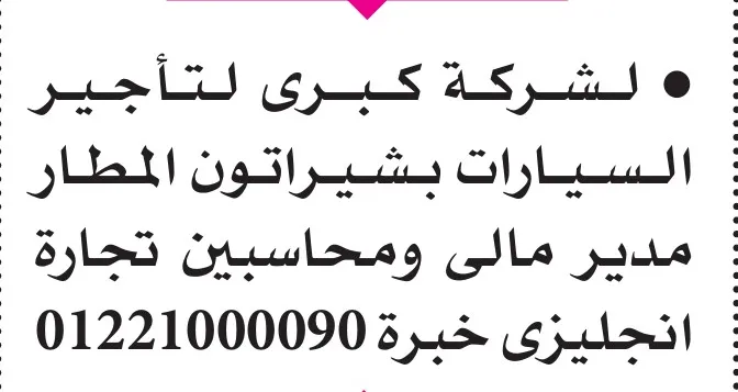 وظائف خالية متنوعة في مزارع وشركات ومدارس خاصة – جريدة الأهرام 3-10-2025 . أعلنت جريدة الأهرام في عدد الجمعة 3 أكتوبر 2025 عن مجموعة وظائف خالية تشمل سائقين لمزارع ومدارس خاصة، بالإضافة إلى وظائف في شركة كبرى لتأجير السيارات بمنطقة شيراتون المطار تشمل مدير مالي ومحاسبين بخبرة تجارة إنجليزي. التفاصيل الكاملة وأرقام الهواتف للتواصل مذكورة في الإعلان. تابع أحدث الوظائف عبر موقع عرب تندر وصفحة فيسبوك الوظائف.