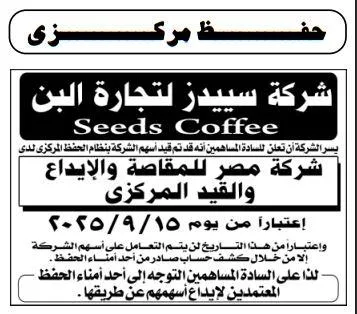 إعلان حفظ مركزي لشركة سيدرز لتجارة البن 15-09-2025 . تعلن شركة سيدرز لتجارة البن (Seeds Coffee) عن قيد أسهمها بنظام الحفظ المركزي لدى شركة مصر للمقاصة والإيداع والقيد المركزي اعتبارًا من يوم 15/9/2025. واعتبارًا من هذا التاريخ لن يتم التعامل على أسهم الشركة إلا من خلال سجلات شركة مصر للمقاصة. تدعو الشركة جميع المساهمين إلى التوجه إلى أحد أمناء الحفظ المعتمدين لإيداع أسهمهم في الحفظ المركزي لضمان سهولة التداول مستقبلاً. للمزيد من التفاصيل زوروا موقع عرب تندر وصفحة فيسبوك المناقصات لمعرفة الإجراءات اللازمة.
