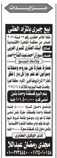 بيع عمارة ومحلات بالمزاد العلني لصالح البنك التجاري المصري العربي – جلسة 4-11-2025 . يُعلن البنك التجاري المصري العربي عن بيع عمارة تتكون من بدروم ومحلات وثلاثة أدوار بكل دور شقتين، وذلك تنفيذًا للأمر العقاري رقم 12 لسنة 2021 الصادر من محكمة القاهرة الاقتصادية ضد سوزان أحمد عبد الفتاح أحمد.