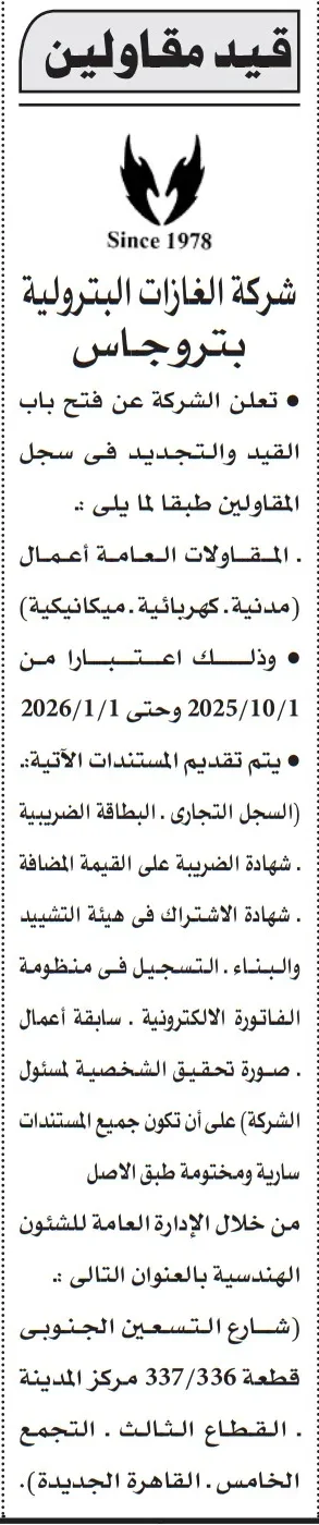 قيد وتجديد سجل المقاولين بشركة الغازات البترولية (بتروجاس) – من 01/10/2025 حتى 01/07/2027 . أعلنت