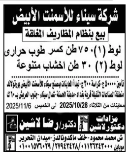 مزاد شركة سيناء للأسمنت الأبيض – بيع طوب حراري وأخشاب متنوعة – 2025