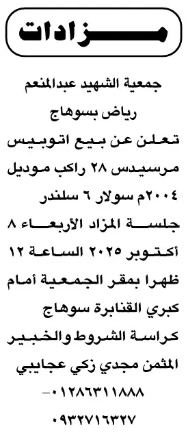 مزاد علني لبيع أتوبيس مرسيدس 28 راكب موديل 2004 بجمعية الشهيد عبد المنعم رياض بسوهاج – جلسة 8 أكتوبر 2025