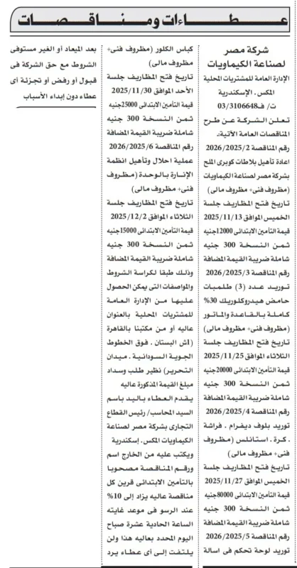 تعلن شركة مصر لصناعة الكيماويات عن طرح عدد من المناقصات العامة لإعادة تأهيل نظم الإنتاج وتوريد معدات وملحقات تشغيلية.